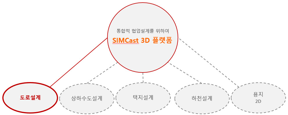 Simcast는 2D, 3D 플랫폼을 기초하여 도로설계 및 다양한 토목사업 SOC건설분야(도시계획, 택지개발, 하천, 상하수도 등)